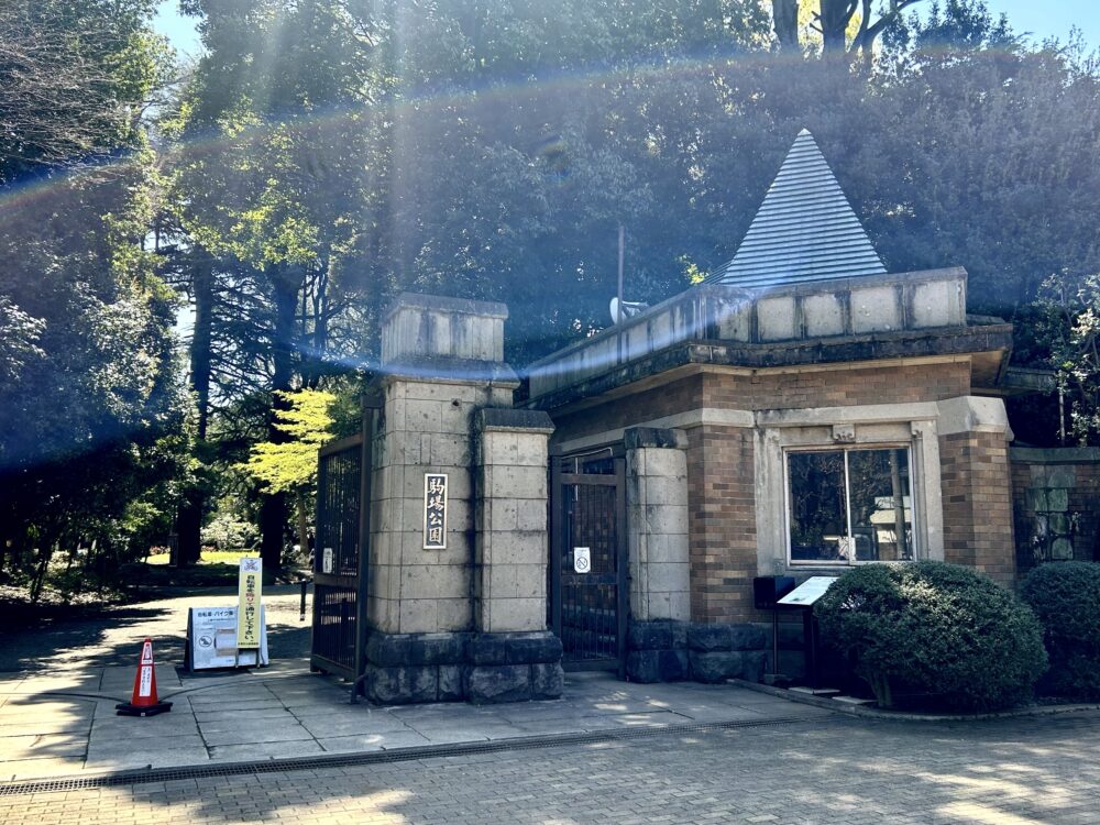 井の頭線駒場東大前駅から、瀟洒な住宅街を歩くこと10分で、目黒区立駒場公園へ到着。石造りのいかめしい門を入ると、左手に木の間隠れに和館が見えてくる。さらに奥へ進むと、若草色の屋根に赤レンガ張りの洋館が目の前に現われる。この洋館と和館が、旧前田家本邸である。