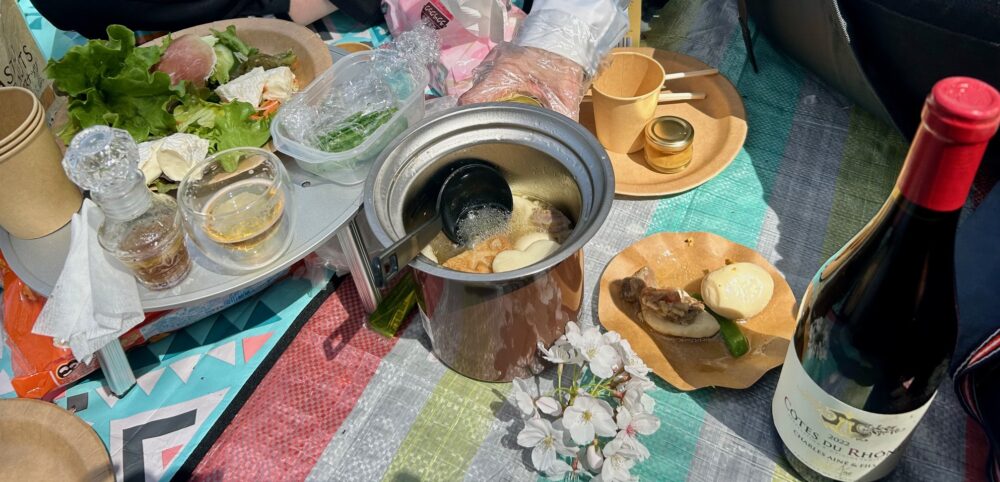 • お花見の持ち込み料理といったらできあいのものかと思っていましたが、ドレッシングも容器に入れ替えて、じっくり煮込まれたおでんも保温容器ごと持参、さすがハイセンスでキャンプ好きのSさんでした。