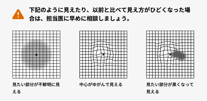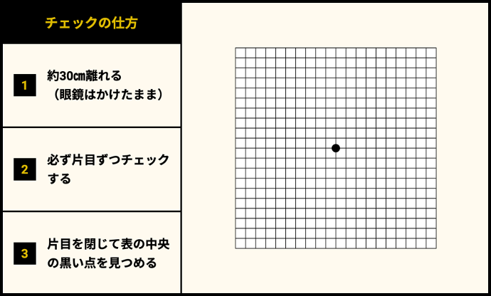 黄斑円孔になると下記のチャートの白い点に焦点をあわせたまさに中心が薄く暗くなったり、消えたり、ゆがんだりするため