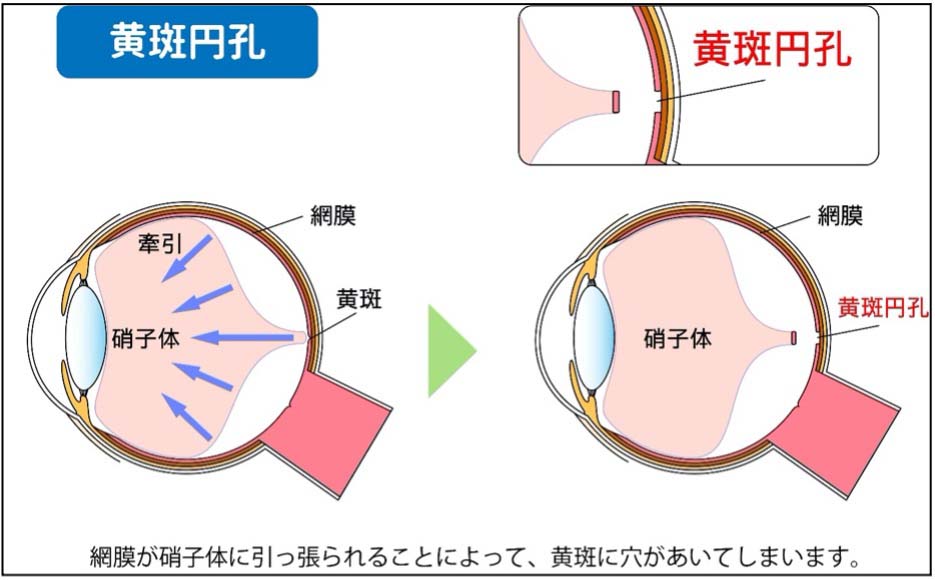 黄斑円孔は、眼の網膜の中心部にある黄斑に小さな穴(円孔)ができ、視力が悪くなる疾患です。黄斑は視力にとって非常に重要な部分で、特に細かいものを見るための中心視力を担っています。黄斑円孔が発生すると、中心視力に影響が出て、視力が低下することがあります。