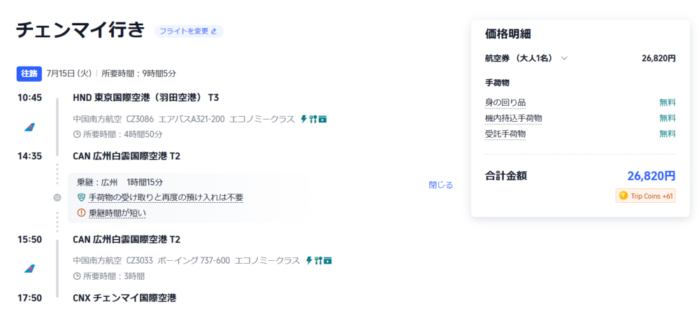中国南方航空 東京➙チェンマイ タイ移住 2025.07.162025.08.26 今回はラッキーなことに羽田発で乗換が昼間で時間が短い、というかやや短すぎですが、がとれたのでわずか滞在1週間で東京からチェンマイへUターン。 羽田空港 中国南方航空のカウンターは空いていました。 事前に座席はウェブで指定してあったのですが、当日何も言わないのにビジネスシートのすぐ後ろというエコノミー最前列にしてくれました。トランスファーの時間が短いことを考慮してくれたのだと思います、えらい中国南方航空。 Sky Lounge South 東京国際空港(羽田) (Tokyo Haneda Intl), 第3ターミナル朝からがんがんウイスキー飲んでる人とかいて安心する。なにが安心なのか 大胆にくつろぐ方が多い中国航空の機内 東京➙広州、機内食 コンビニのお弁当みないなかまぼこ、卵、きんぴらあり 広州到着、乗換が短いので人の少ない空港内をとにかく走った 光り輝く広州の空港 あっという間に保安検査に到着、すいてました 飛行機から真っ先に降りたこともあり、乗換時間75分なのになんとラウンジに行く時間ができました お菓子がおいしい、焼き芋も美味しい 今回は小さいお子様が多かったですわ 広州➙チェンマイの飛行機に搭乗 広州➙チェンマイ 機内食 チキンの甘辛煮みたいな、