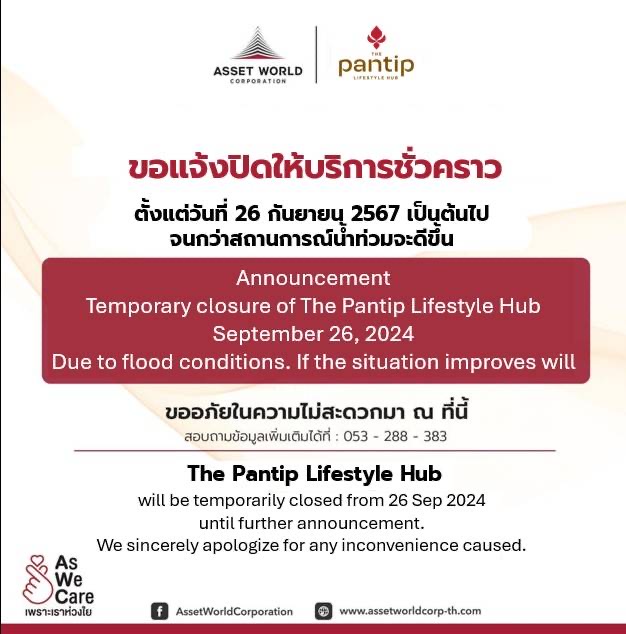 にお電話願います。3 また、これまでお知らせしているとおり、ピン川付近地域にお住まいの方は、状況に応じて、家財を移動する、電気のブレーカーを切る、安全な場所への避難を行うなどの対策を取るほか、なるべく洪水地域には近づかないようにするとともに、やむを得ず洪水地域を歩行する場合には地面の状況に細心の注意を払うようお願いいたします。