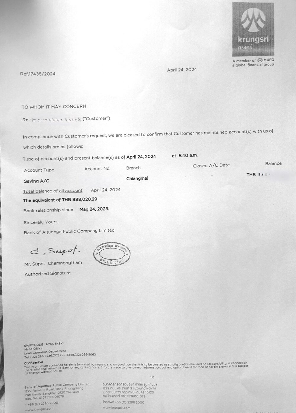 Bank Deposit in a Thai Bank for at least 800,000 Thai Baht