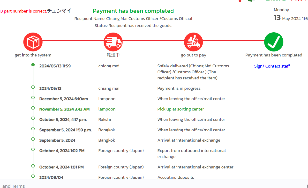 そこで追跡をタイのThailand Post Trackingで調べてみると