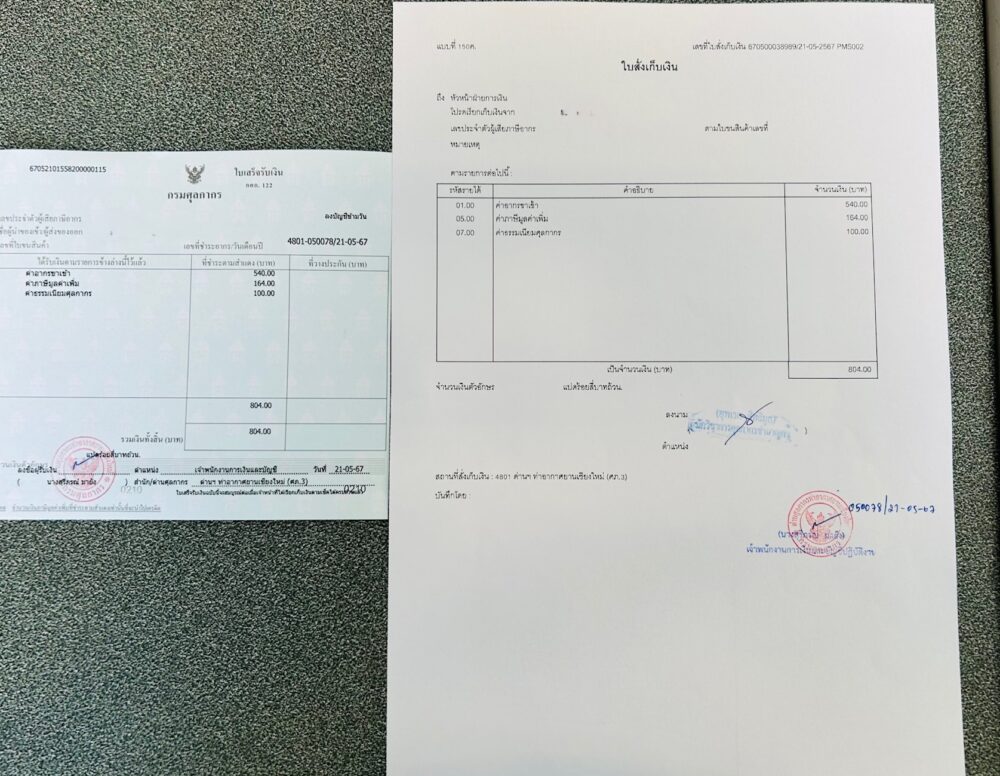 「これを2階で支払ってくるように」と渡された用紙にはなぜか804baht、そして2階の窓口で支払い、無事引き取ることができました。