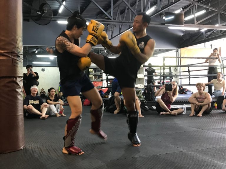 タイのチェンマイで本格的ムエタイ道場でムエタイグローブをし、ムエタイ体験レッスンを受けている私。