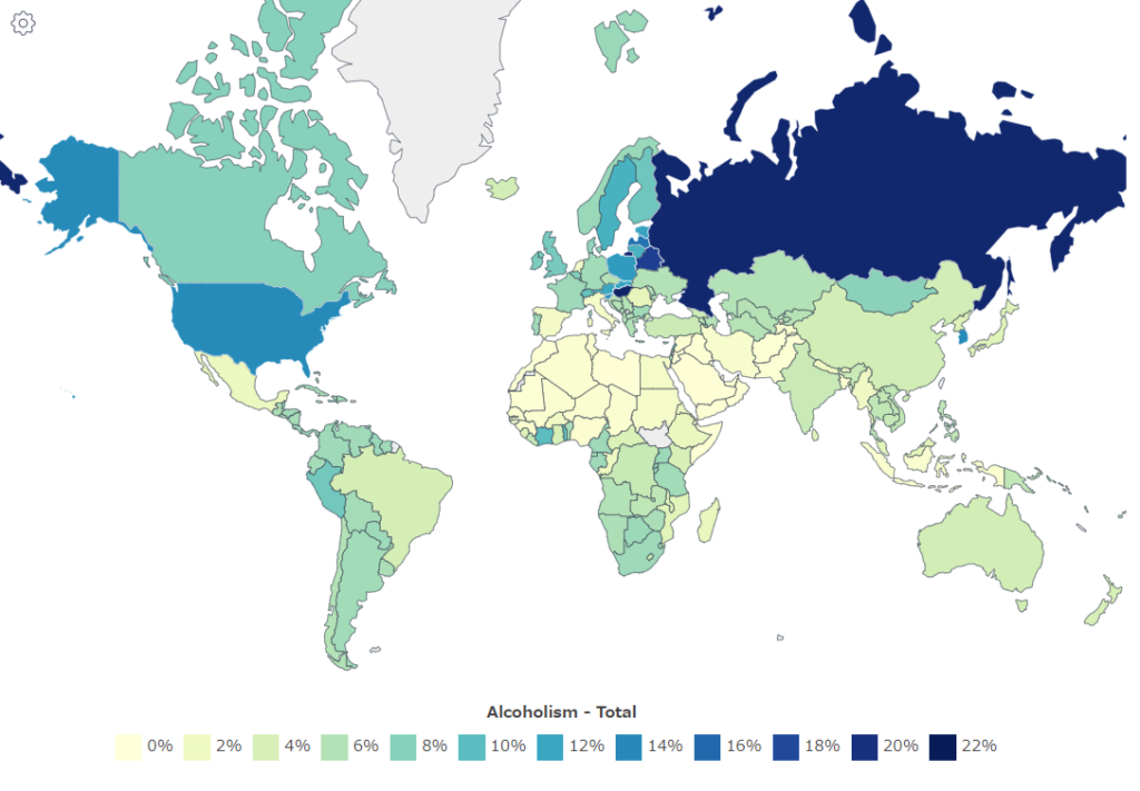日本は24時間、どこででもいくらでも安価で入手できるのは、アルコール依存症の割合が世界に比べて低いからなんでしょうか、それにしてもエストニアは10位なんだ。