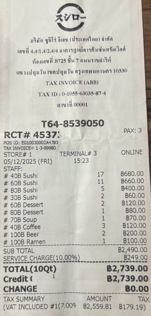 | コメント | 日本もおもてなし接客ですが、ここタイはさらに丁寧な接客でした。 それもそのはず、レシートを見たらサービス料10%加算されていました。 日本でもですがネタが薄い、物価高ですししようがないか。 |