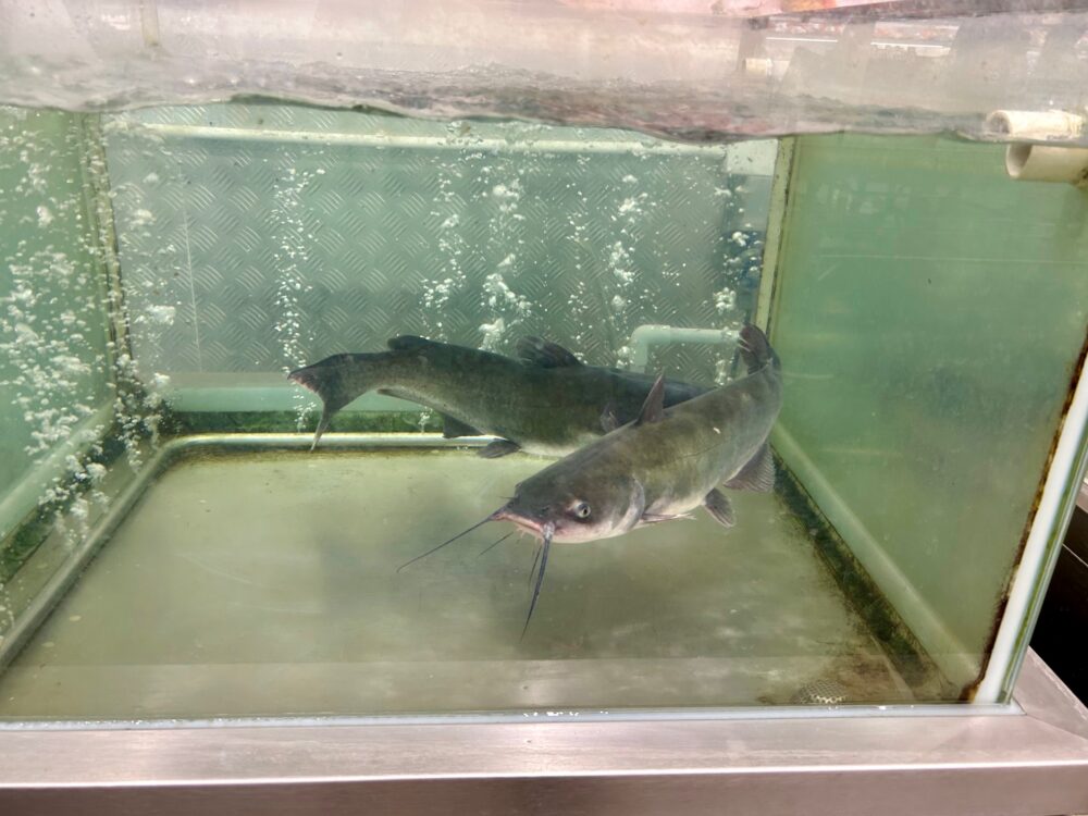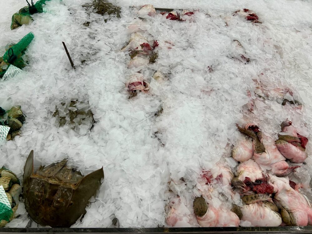 この「マクロ」の倉庫みたいな感じ、良いですね。品物もものすごく豊富な感じ。写真に「なまず」の説明が一言ついているのはなんだか可笑しい。氷からのぞく蛙(でしょう?)のお腹はシュール。マーケットにはよく出ているようですが、こんなに需要があるということですか。これっていつもカブトガニ?みたいなのと一緒に置かれていませんか?
