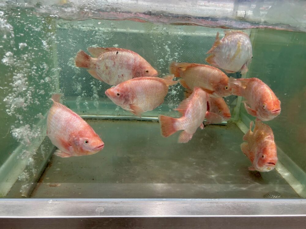 スーパーではすでにお亡くなりになっていますが(多分)、市場ではバケツに網がかかり、飛び出さないようになっています。
